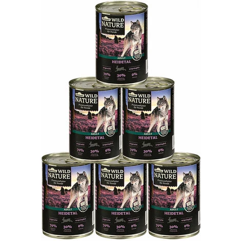Steckt nicht in jedem unserer Hunde ein Wolf? Die Ansprüche an seine Nahrung sowie der Aufbau des Verdauungssystems zeigen bei Wolf und Hund trotz Domestizierung noch immer eindeutige Parallelen. Dehner Wild Nature nimmt sich die ursprüngliche Futterauswahl in freier Wildbahn zum Vorbild. Dass Dehner Wild Nature Heidetal Adult Ihrem Vierbeiner schmeckt, erklärt sich schon allein durch den hohen Gehalt an frischem Fleisch und der 100 % natürlichen Zusammensetzung. Die ausgewogene, vielseitige Rezeptur vom hochwertigen Hundenassfutter Dehner Wild Nature orientiert sich an der ursprünglichen Ernährung des wilden Ahnen unseres Hundes: ein hoher Fleischanteil, abwechslungsreich kombiniert mit Gemüse, Obst, Kräutern und Beeren. Durch den Verzicht auf Getreide in diesem köstlichen Futter für Hunde kommt die Hundenahrung einer für die Wildnis typischen Ernährung gleich. Ihr vierbeiniger Liebling wird dieses köstliche, getreidefreie Hundefutter lieben und ist er ernährungssensibel oder Allergiker, der nicht jedes Futter verträgt, eignet sich Wild Nature bestens. Die sorgfältig ausgewählten Rohstoffe sind in ihrer Zusammenstellung der Natur nachempfunden und versorgen Ihren ausgewachsenen Hund mit allen wichtigen Nährstoffen im Sinne einer ganzheitlichen Ernährung. Zur hohen Qualität tragen die qualitativ hochwertigen Rohstoffe und zum Erhalt der wertvollen Vitamine eine behutsame Herstellung und eine schonende Abfüllung jeder Dose bei. Gönnen Sie Ihrem Vierbeiner ein auf seine Altersgruppe abgestimmtes Hundefutter Dehner Wild Nature Heidetal Adult – natürlich und ganz ohne künstliche Zusatzstoffe wie chemische Farb-, Lock-, Aroma- und Konservierungsstoffe. Auch ist es frei von Zucker, Soja sowie gentechnisch veränderte Zutaten.