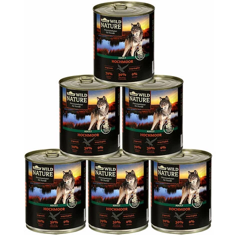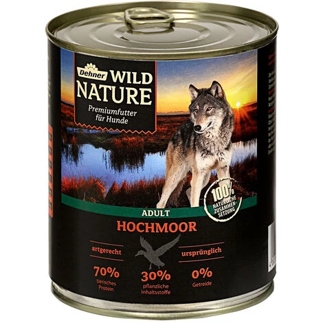 Die Ansprüche an seine Nahrung sowie der Aufbau des Verdauungsystems zeigen, dass der Hund trotz Domestizierung dennoch viel mit dem Wolf gemeinsam hat. Die ursprüngliche Futterauswahl in freier Wildbahn des wilden Ahnen unseres Hundes hat sich Dehner Wild Nature daher zum Vorbild genommen. Das leckere Hundenassfutter Wild Nature ist artgerecht und proteinreich. Die vielseitige, ausgewogene Rezeptur vom Dehner Wild Nature Hochmoor Adult Nassfutter mit den sorgfältig ausgewählten, qualitativ hochwertigen Rohstoffen tragen zu einer ganzheitlichen und natürlichen Ernährung von Ihrem Vierbeiner bei. Der Hund ist ein Fleischfresser aber dennoch auf pflanzliche Bestandteile in seiner Nahrung angewiesen. Das köstliche und schonend hergestellte Dehner Wild Nature Hochmoor Adult Hundefutter hat einen hohen Fleischanteil, der abwechslungsreich kombiniert wird mit Gemüse, Obst, Kräuter und Beeren. Da bei der Herstellung dieses hochwertigen Futters für ausgewachsene Hunde auf Getreide verzichtet wird, kommt die Hundenahrung einer für die Wildnis typischen Ernährung gleich und eignet sich daher bestens für Hunde mit Futtermittelunverträglickeiten und Allergien, die nicht jedes Futter vertragen. Mit diesem Premiumfutter für Hunde, welches in seiner Zusammenstellung der Natur nachempfunden, versorgen Sie Ihren vierbeinigen Freund mit allen wichtigen Nährstoffen und Vitaminen im Sinne einer ganzheitlichen Ernährung. Beim getreidefreien Hundefutter wird natürlich konsequent auf chemische Farb-, Lock-, Aroma- und Konservierungsstoffe verzichtet. Auch Zucker, Soja sowie gentechnisch veränderte Zutaten sind hier nicht zu finden.