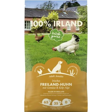Entdecken Sie jetzt Irish Pure! Die Sorte Irisches Freiland-Huhn mit Gemüse & Kelp-Alge, Adult besteht aus besten Zutaten, die genauestens auf die Bedürfnisse von Ihrem Hund abgestimmt sind! Die 65 % Freiland-Huhn sprühen nur so vor wertvollen Proteinen, die Ihrem Hund beim Muskelaufbau unterstützen und Energie liefern. 32 % des Futterns bestehen aus feinstem irischem Gemüse und zu 3 % des Superfoods Kelp-Alge. Produkte von Irish Pure sind zu 100 % getreidefrei. Nicht nur die Zusammensetzung des Futters ist optimal, ebenfalls die Haltung der Weidetiere. Bestes Fleisch aus irischer, ganzjähriger Freilandhaltung (365 Tage) und Gemüse aus irischem Anbau sind optimale Nährstofflieferanten – keine Medikamente, keine Gentechnik. 100 % natürlich, 100 % irisch, 100 % gesund für Ihren Hund!Adult Tierart: Hund Inhalt: 1,5 kg Futterart: Alleinfuttermittel Futterform: Trockenfutter Zusammensetzung: Getrocknetes Hühnerfleisch 30,5 %, frisches Hühnerfleisch 26,0 %, Süßkartoffeln 9,5 %, Kartoffelmehl